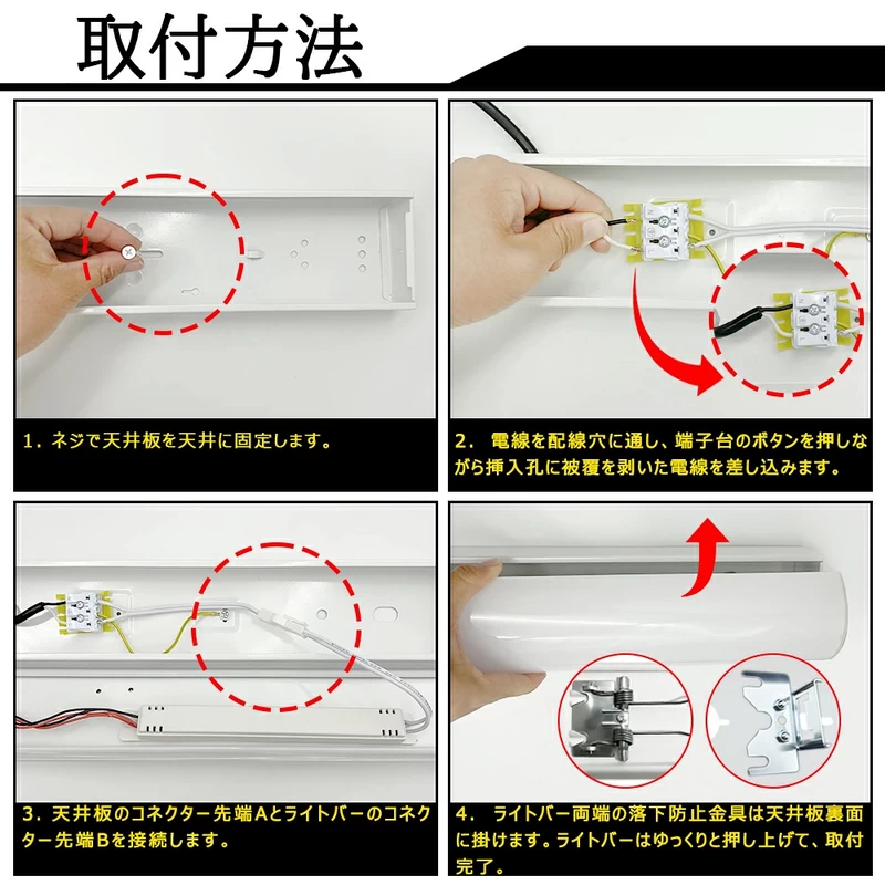 - 秒即着脱:天井への固定ネジが不要(※既存取付穴利用)業界速メンテナンスLED直管40W交換作業を数秒で完了(従来工法の1/10時間)専用ツール不要でワンタッチランプ交換可能