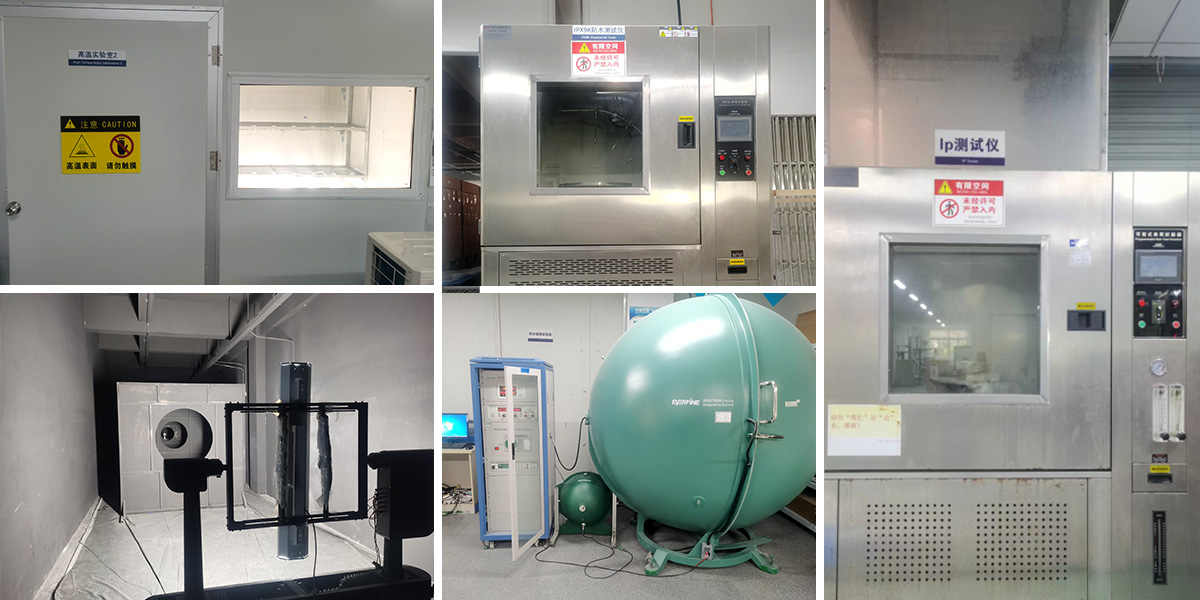 Dust and water chambers are used to check IP rating of the light fittings, including sealing tests underwater. Heat measurements to check the maximum admissible ambient temperature, low temperature tests and material ageing tests performed in climatic chambers, especially for explosion-protected light fittings, finish the test program for LEDRHYTHM.